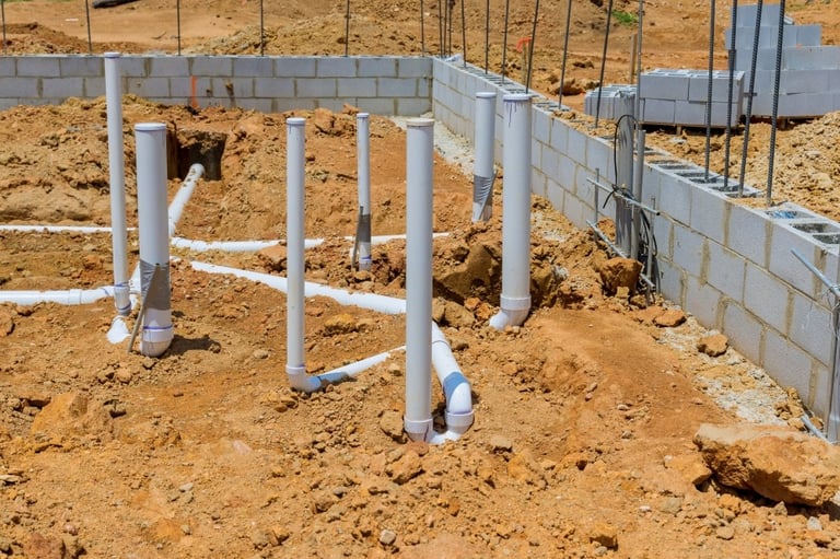 Foundation stage: Underground drains and stubs are set to the exact layout before the slab is poured, ensuring every bathroom and kitchen lines up perfectly.