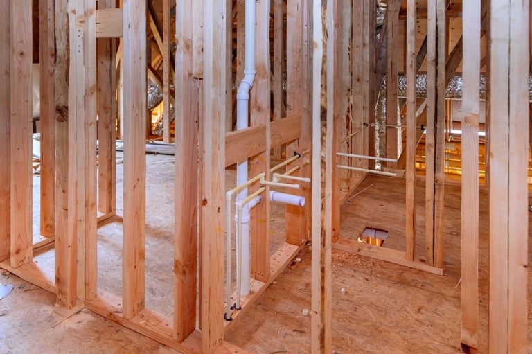 Interior rough-in: Supply, vent and drain lines are aligned inside the framing, ready to pass inspection and receive fixtures without surprises.