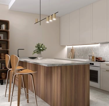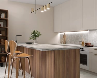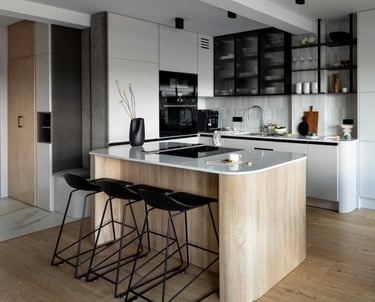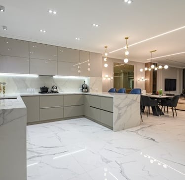 Custom Cabinetry & Surface Installation: Cabinets, islands, countertops and backsplashes are installed with precision, creating a balanced kitchen that combines durability, modern design and everyday usability.