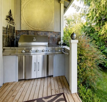 Design and construction of outdoor kitchens with countertops, grills, sinks, storage, and appliance-ready layouts.