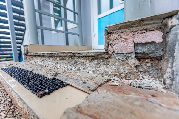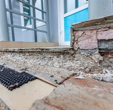 Deteriorated Entry & Structural Damage: Cracked concrete, exposed masonry, and surface erosion caused by moisture intrusion and structural wear. These conditions affect safety, drainage, and long-term stability of the entry area.