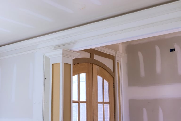 Installation of baseboards, crown molding, door and window casing, and decorative trim for a refined, finished appearance.