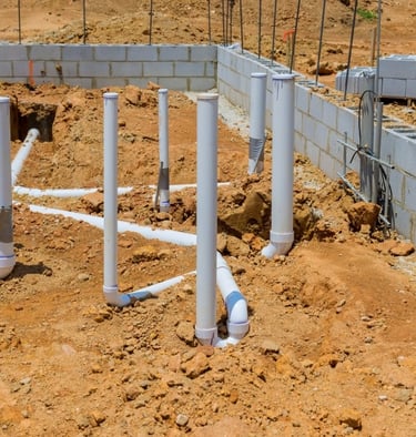 Foundation stage: Underground drains and stubs are set to the exact layout before the slab is poured, ensuring every bathroom and kitchen lines up perfectly.